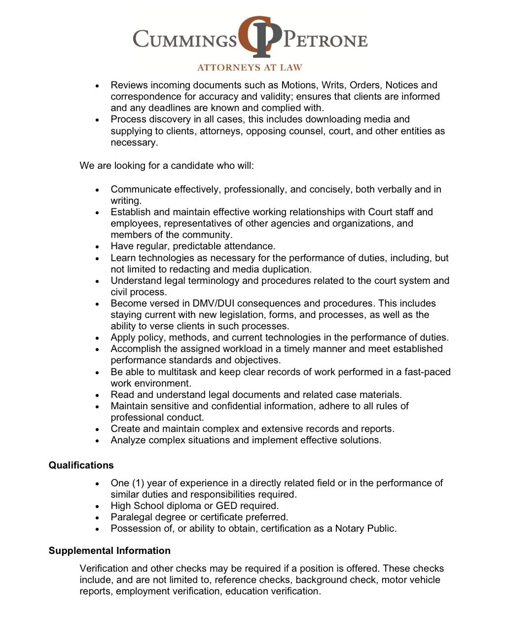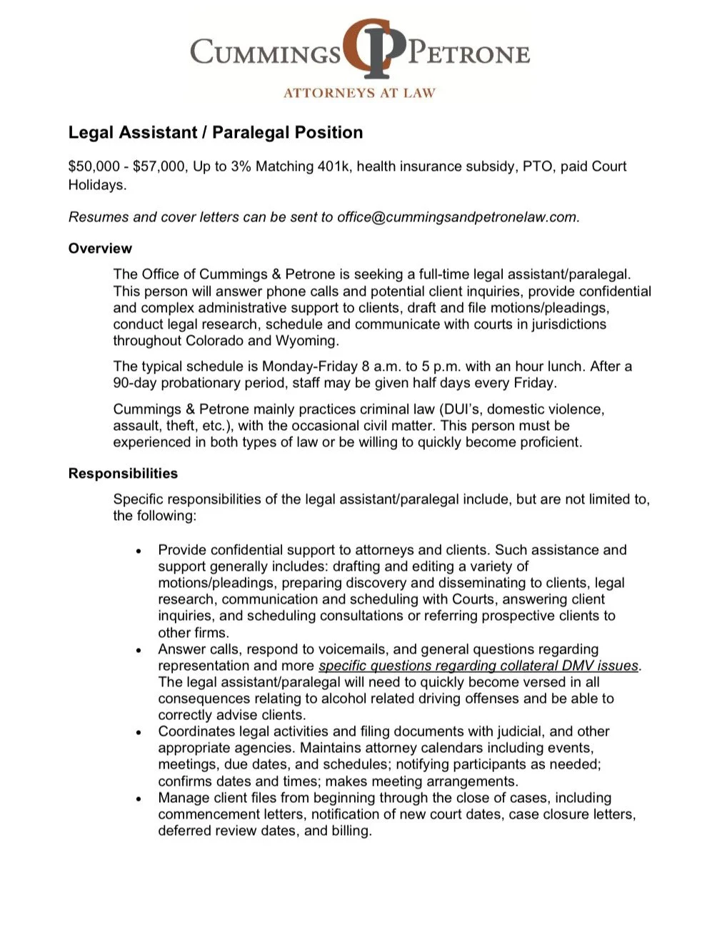 September 20, 2025 Cummings and Petrone Law Hiring for Legal Assistant / Paralegal Position September 20, 2025/ LCBA Administrator www.cummingsandpetronelaw.com Contact:Sarah Kirkoffice@cummingsandpetronelaw.com970-484-2217