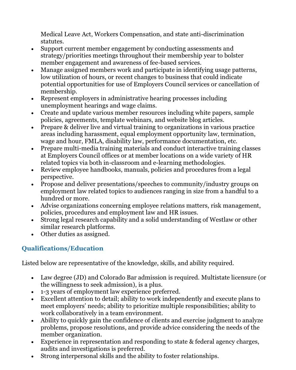October 21, 2025 Employers Council Seeking Employment Attorney in the Northern Colorado Area October 21, 2025/ LCBA Administrator Phone: 303-223-5351Email: spatterson@EmployersCouncil.org Employers Council Website