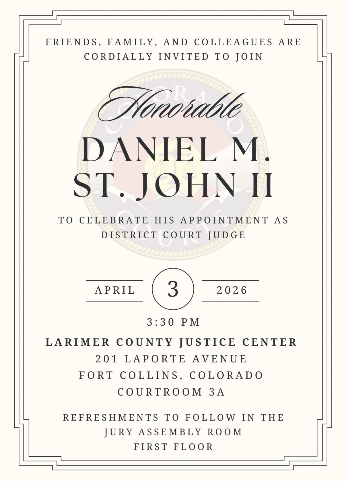 Friends, family, and colleagues are warmly invited to join us in celebrating Judge St. John and this significant occasion. We look forward to honoring his dedication to Larimer County and to the administration of justice.